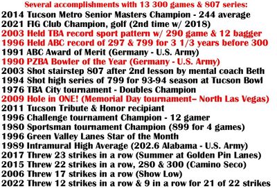 I’ve included a Facebook post I made about a recent Senior Masters tournament and comments to my post. (It's the next article on this webpage.) Bowlers and people making judgements who don’t know the whole story, is one reason why I don’t post much. What they said and didn’t say by their ha ha’s, made me take the time to show their flawed reasoning for my post. I lived an exciting sports life by everything I accomplished in bowling and now golf, and what I learned in the process help me win over 20 league championships, a TBA City Doubles title, shooting 13 300 games in tournaments and league, an 800 series, many individual tournament wins and top five finishes, winning $10,000 in 26 USBC nationals and side events, and my one major, and winning the 2014 Senior Masters averaging 244 for all 18 games I bowled. I’m very proud to be able to share why that what I learned, has shown others I’m not an easy target. I hope this article will wake some people up to reality as not everyone can compete at a higher level, unless they start to put in some work to make improvements.